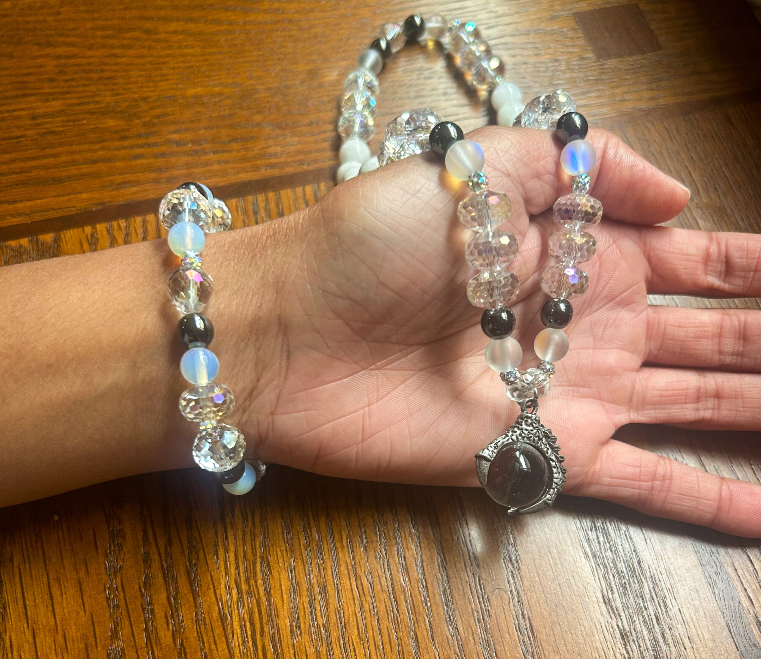 The Moonlight Clarity Set includes a handcrafted necklace and matching bracelet made with Opalite, Clear Quartz, and Hematite. Designed as a harmonious duo, this set amplifies calm energy and balance in your daily life.